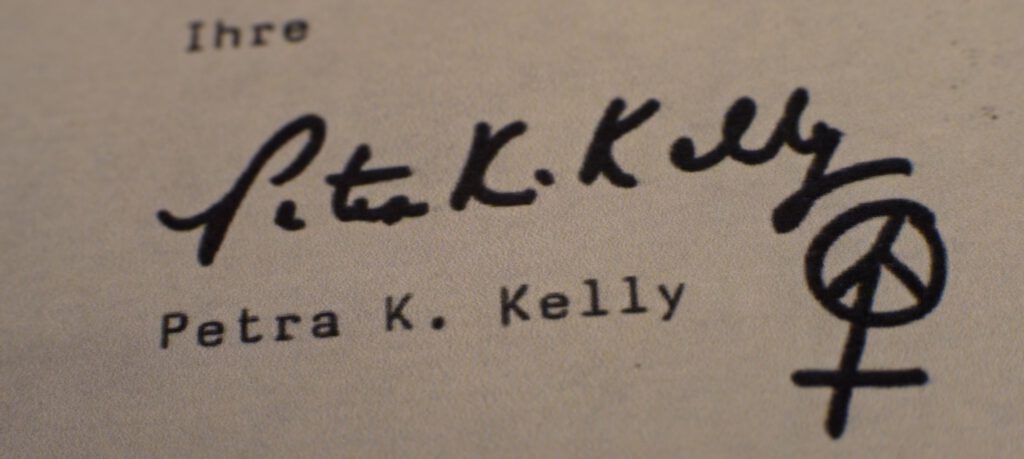 Das Friedenszeichen jener Generation hatte Petra Kelly als Teil ihrer Unterschrift unter eine ihrer Petitionen gesetzt. (Filmszene aus „Petra Kelly – Act now!“ (c) Real Fiction Filmverleih e.K.)